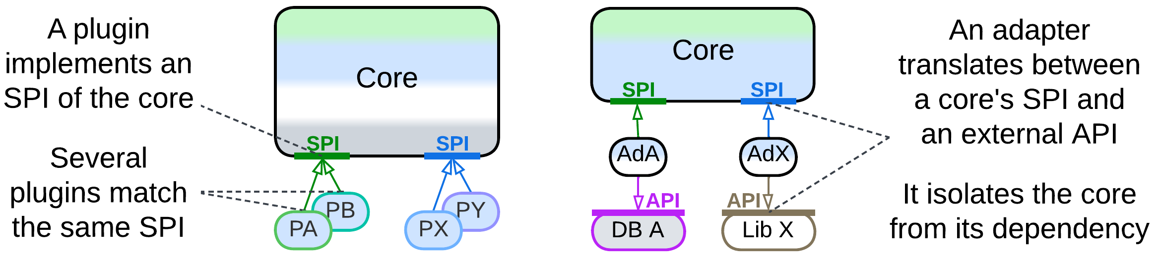 Both Plugins and the derived Hexagonal Architecture rely on dependency inversion for the same reason – to protect the core, which contains the bulk of the code, from variability in the external components it uses. The core operates interfaces (SPIs) which it defines so that it may not care whatever is behind an interface.