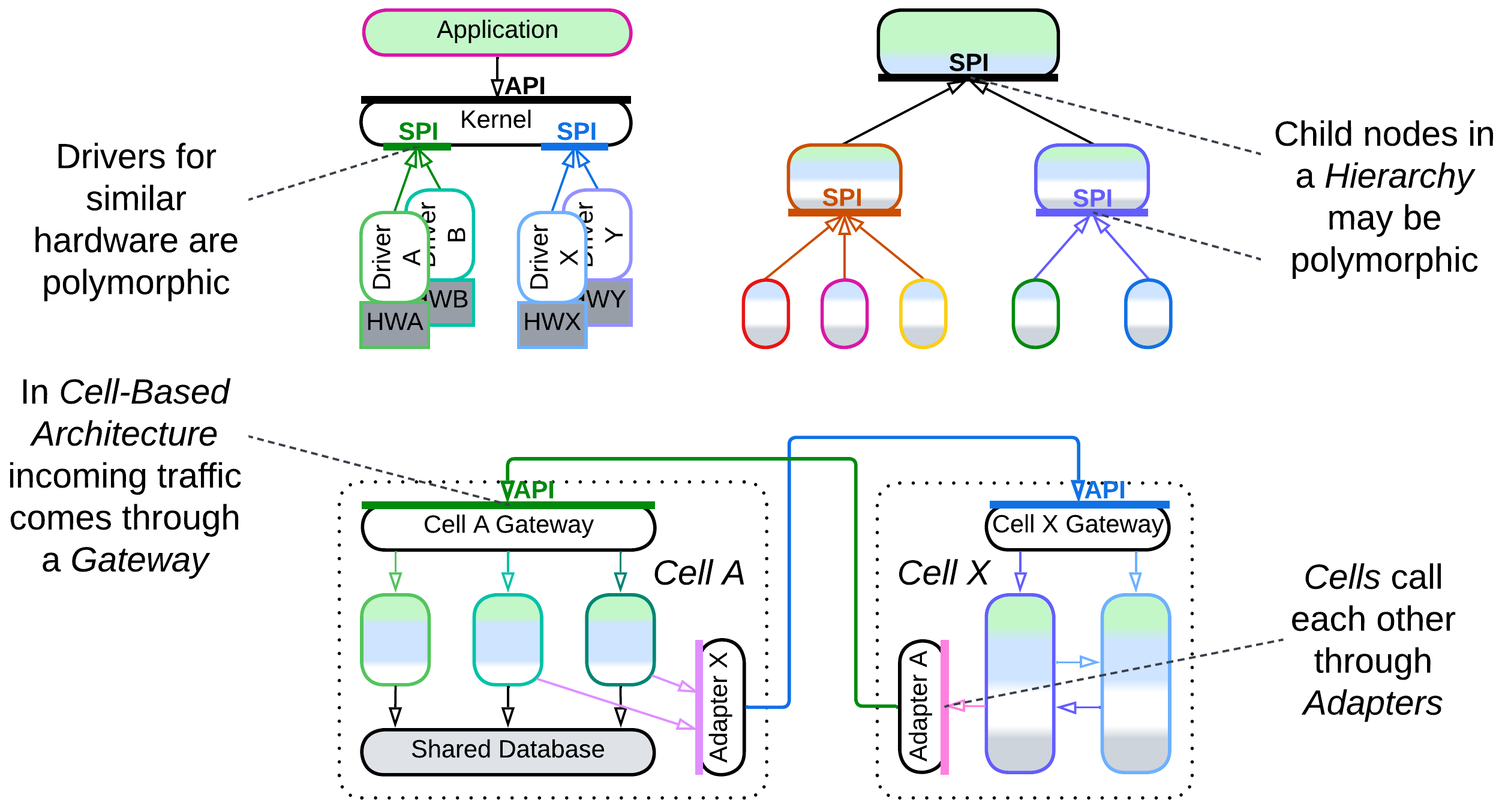 - In another kind of Hierarchy, namely Cell-Based Architecture (aka Services of Services), each Cell may employ a Cell Gateway and outbound Adapters to isolate its business logic from the environment – just like Hexagonal Architecture does for its monolithic core.