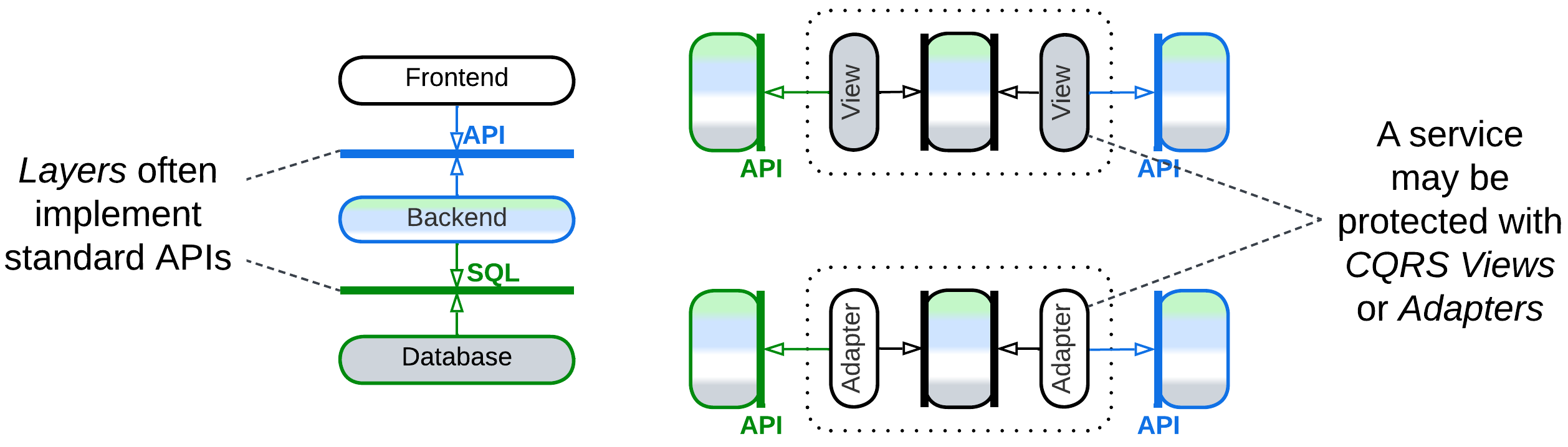 - A service may follow the concept of Hexagonal Architecture by using an Anti-Corruption Layer [DDD] or CQRS Views [MP] as Adapters that protect it from changes in other system components.