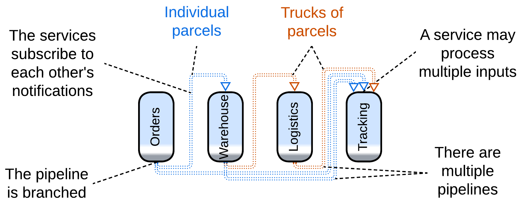 - There are multiple types of events going in different directions, like if several branched pipelines were built over the same set of services.