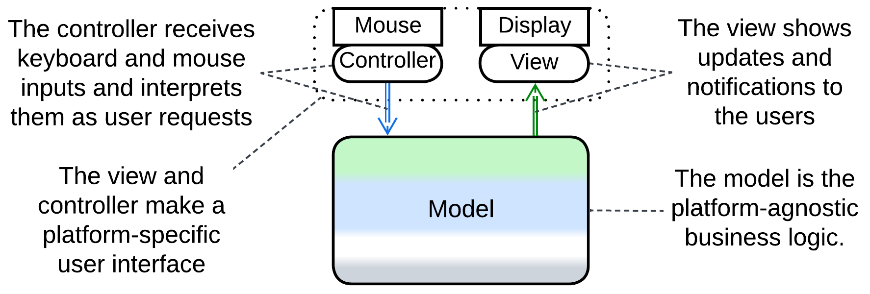 Model-View-Controller [POSA1] completely neglects the type and identity limitations. It is a coarse-grained pattern where the input source produces many kinds of events that go to the main module which does something and outputs another stream of events of no obvious relation to the input. A mouse click does not necessarily result in a screen redraw, while a redraw may happen on timer with no user actions. In fact, the pattern conjoins two different short pipelines.