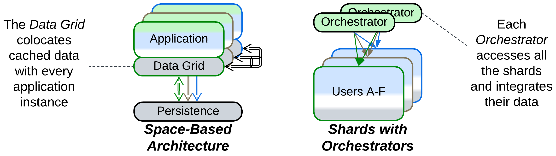 - Orchestrator is a mirror image of Shared Database, another option to implement use cases that deal with data of multiple shards without the need for the shards to intercommunicate. Stateless Orchestrators scale perfectly but may corrupt the data if two of them write to an overlapping set of records.