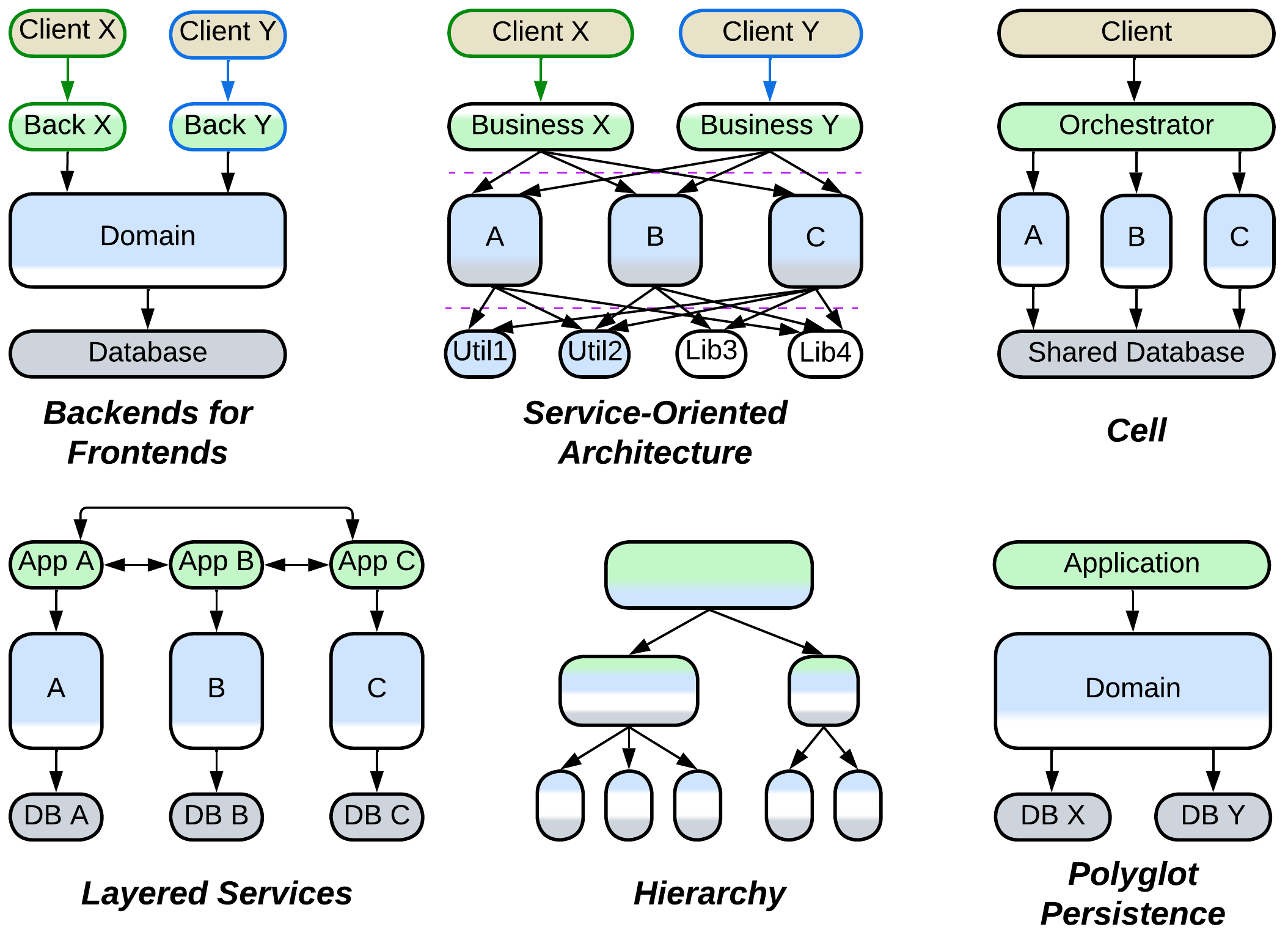 - Splitting the layer with the main business logic results in Services, possibly augmented with layers of Middleware, Shared Database, Proxies and/or Orchestrator.