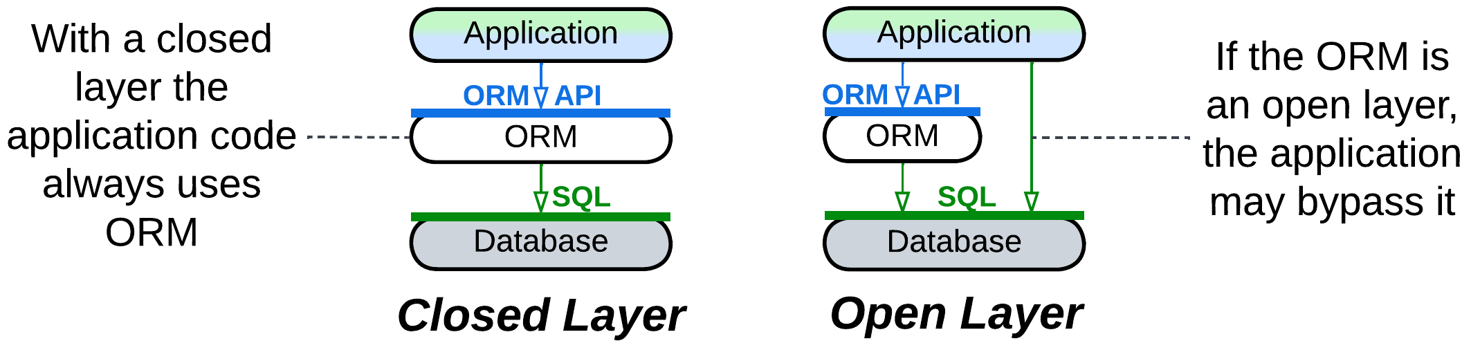 A layer can be closed (strict) or open (relaxed). A layer above a closed layer depends only on the closed layer right below it – it does not see through it. Conversely, a layer above an open layer depends on both the open layer and the layer below it. The open layer is transparent. That helps keep a layer which encapsulates one or two subdomains small: if such a layer were closed, it would have to copy much of the interface of the layer below it just to pass the incoming requests which it does not handle through to the layer below. The optimization of the open layer has a cost: the team that works on the layer above an open layer needs to learn two APIs which may have incompatible terminology.