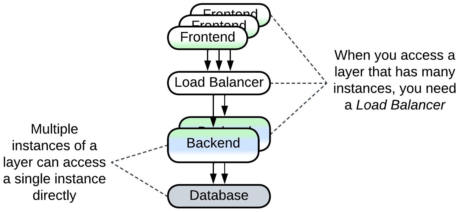 If you ever need to scale (run multiple instances of) a layer, you may notice that a layer which sends requests naturally supports multiple instances, with the instance address being appended to each request so that its destination layer knows where to send the response. On the other hand, if there are multiple instances of a layer you call into, you need a kind of Load Balancer to dispatch requests among the instances.