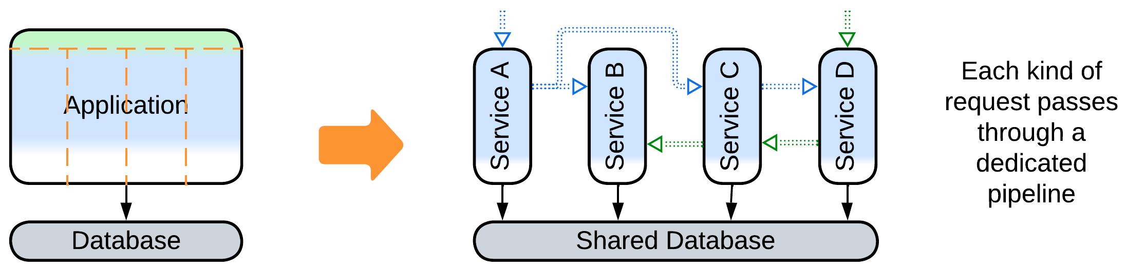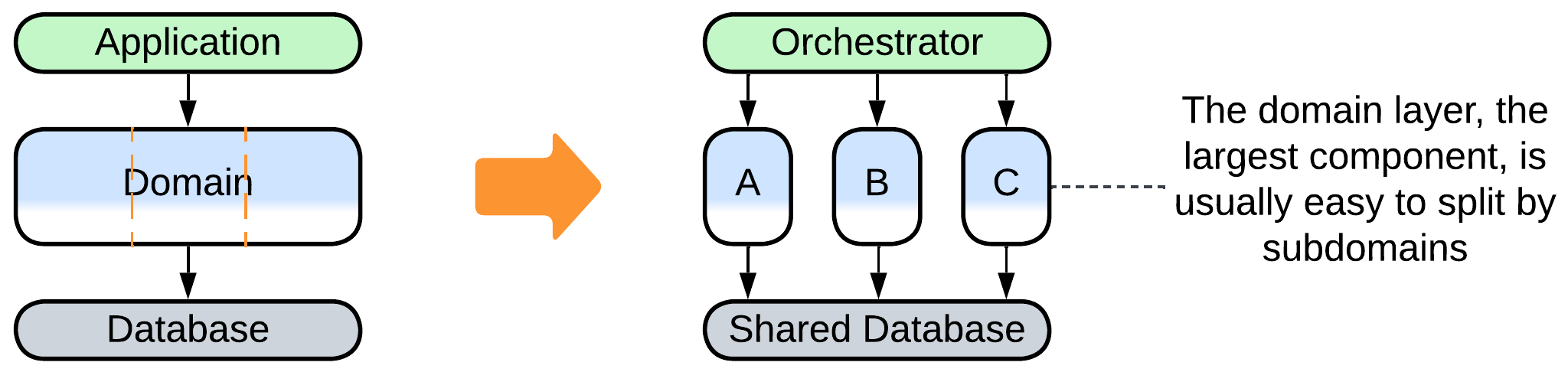 - The middle layer with the main business logic can be divided into Services leaving the upper Orchestrator and lower database layers intact for future evolutions.