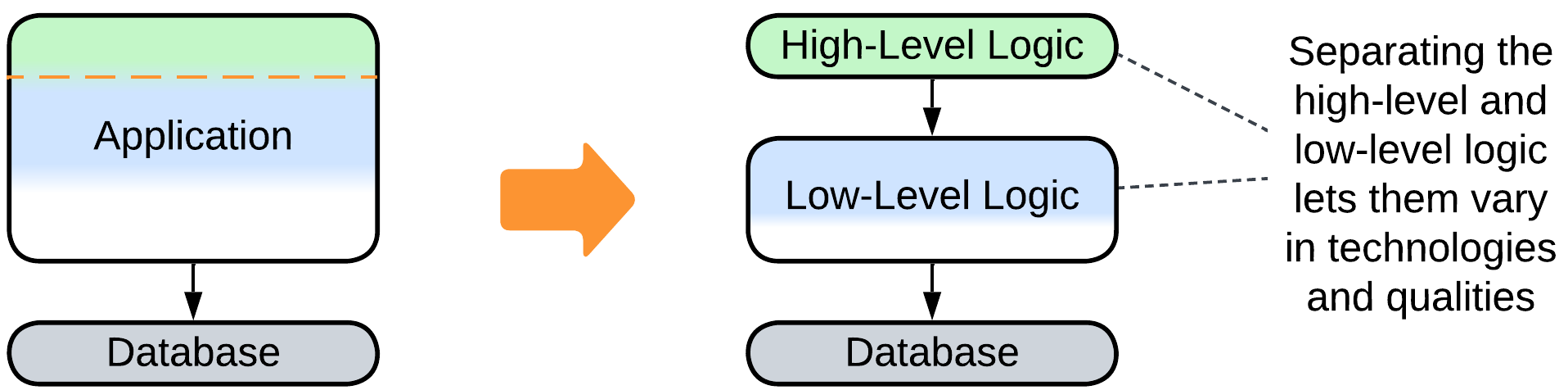 Splitting a system into layers tends to resolve conflicts of forces between its abstract and optimized parts: the top-level business logic changes rapidly and does not require much optimization (as its methods are called infrequently), thus it can be written in a high-level programming language. In contrast, infrastructure, which is called thousands of times per second, has stable workflows but must be thoroughly optimized and extremely well tested.