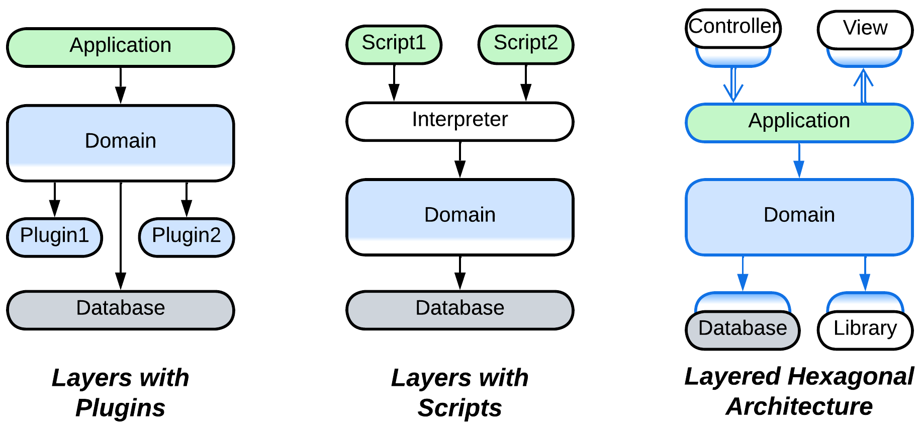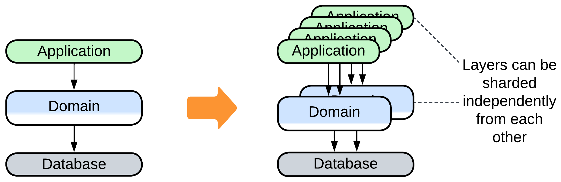 Layering a system creates interfaces between its levels of abstractness (high-level use cases, lower-level domain logic, infrastructure) while also retaining monolithic cohesiveness within each of the levels. That allows both for easy debugging inside each individual layer (no need to jump into another programming language or re-attach the debugger to a remote server) and enough flexibility to have a dedicated development team, tools, deployment, and scaling policies for each. Though layered code is slightly better than that of Monolith, thanks to the separation of concerns, one of the upper (business logic) layers may nonetheless grow too large for efficient development.