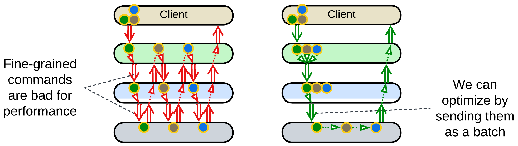 Batching: an upper layer forms a queue of commands and sends it as a single job to the layer below it. This takes place in drivers for complex low-level hardware, like printers, or in database access as stored procedures. [POSA4] describes the approach as Combined Method, Enumeration Method and Batch Method patterns. Programming languages and frameworks may implement foreach and map/reduce which allow for a single command to operate on multiple pieces of data.