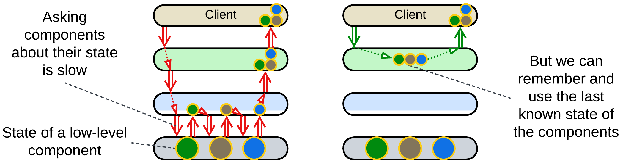 Caching: an upper layer tends to model (cache last known state of) the layers below it. This way it can behave as if it knew the state of the whole system without querying the actual state from the hardware below all the layers. Such an approach is universal for control software. For example, a network monitoring suite shows you the last known state of all the components it observes without actually querying them – it is subscribed to notifications and remembers what each device has previously reported.