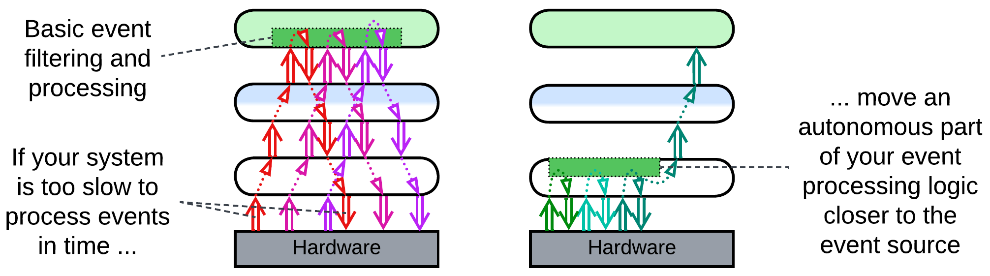 Strategy injection: an upper layer installs an event handler (hook) into the lower layer. The goal is for the hook to do basic pre-processing, filtering, aggregation, and decision making to process the majority of events autonomously while escalating to the upper layer in exceptional or important cases. That may help in such time-critical domains as high-frequency trading.
