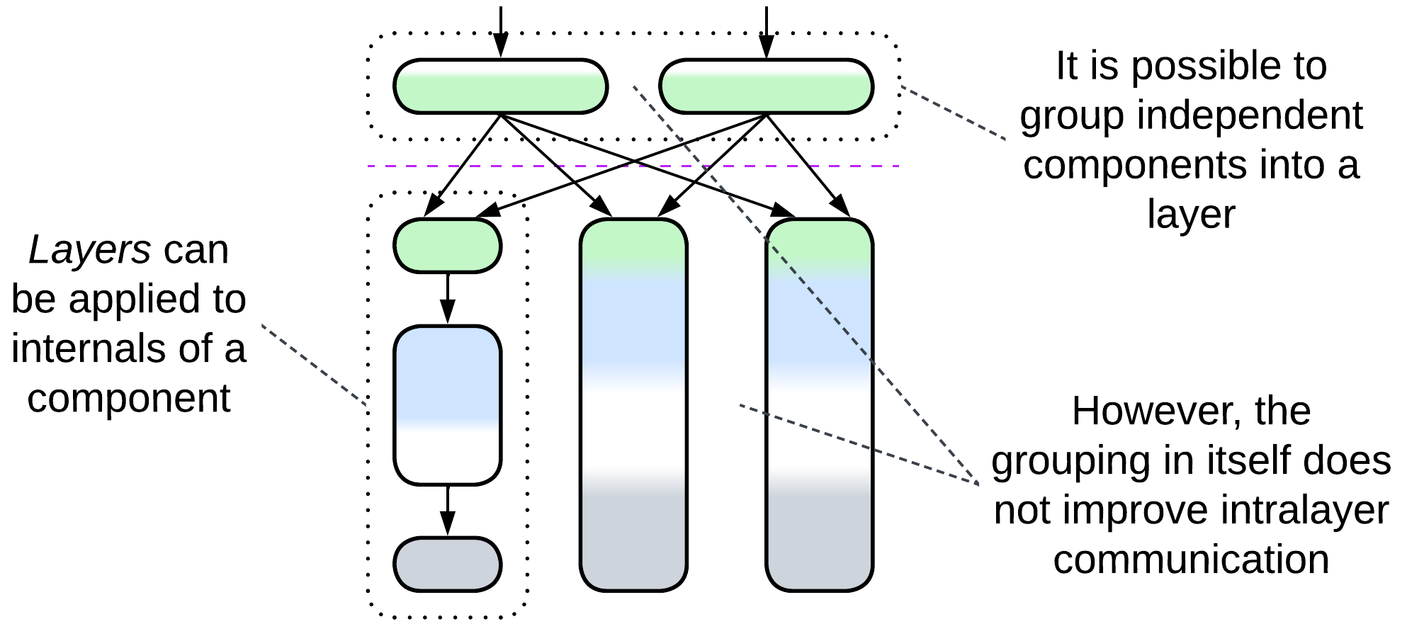 - Communication between layers is slower than within a layer. Components of a layer may access each other’s data directly, while accessing another layer involves data transformation (as interfaces tend to operate generic data structures), serialization, and often IPC or networking.