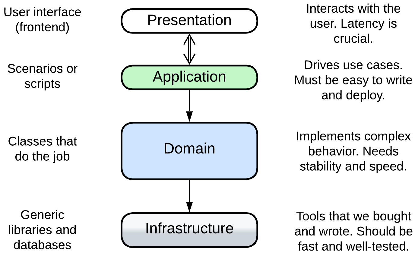- Domain (Model, Business Rules) – the bulk of the mid- and low-level business logic. It should usually be well-tested and performant.