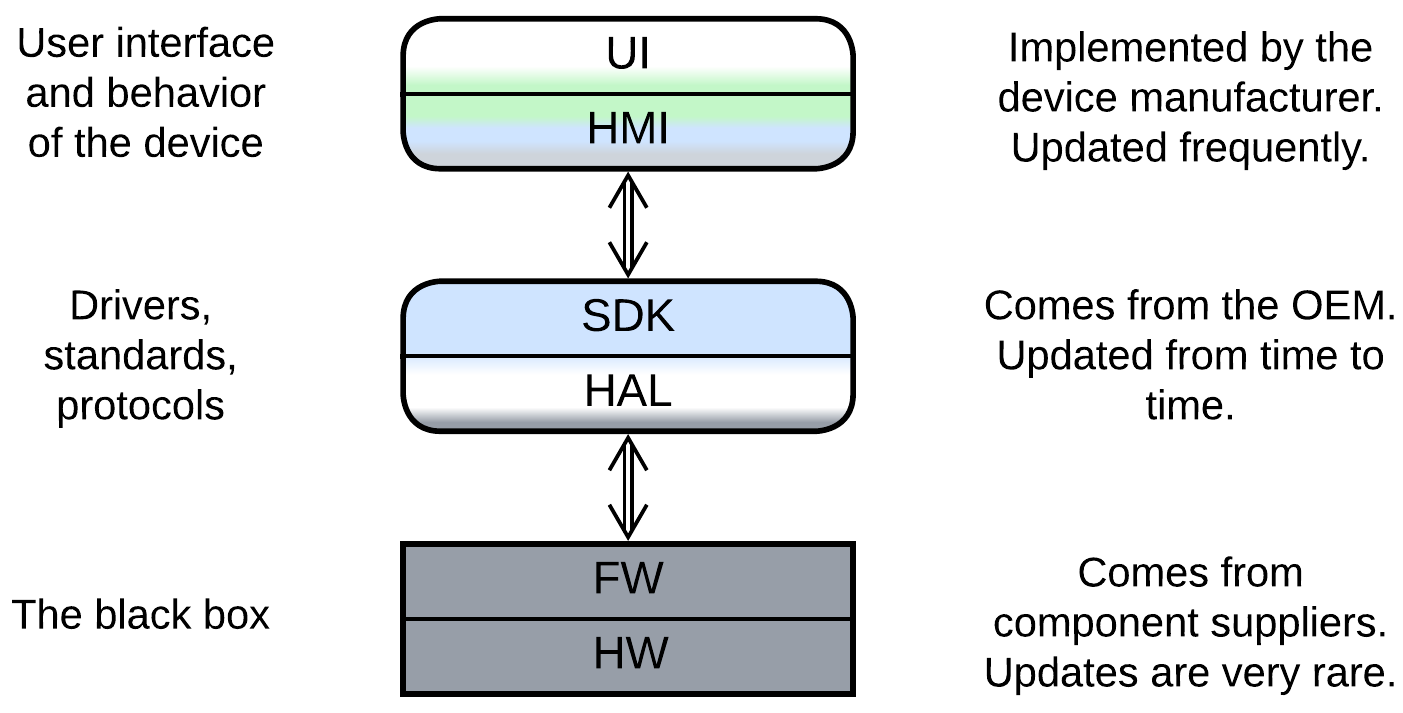 - Software Development Kit (SDK) – the mid-level business logic and device drivers, written by the original equipment manufacturer.