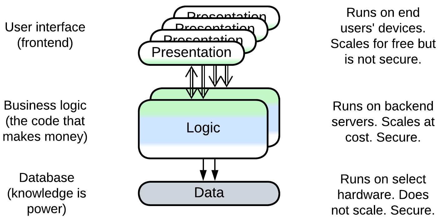 - Presentation (Frontend) tier – a user-facing application which runs on a user’s hardware. It is very scalable and responsive, but insecure.