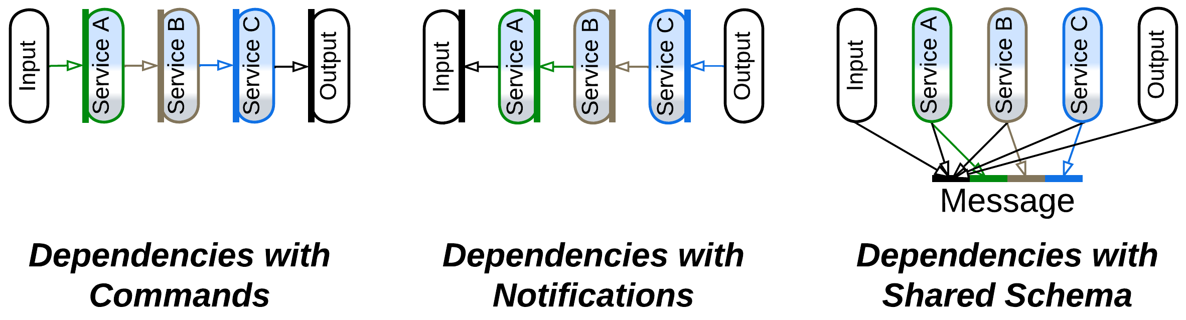 - Services may share a message schema, in which case all of them depend on it, not on each other. That allows for reshuffling the services.