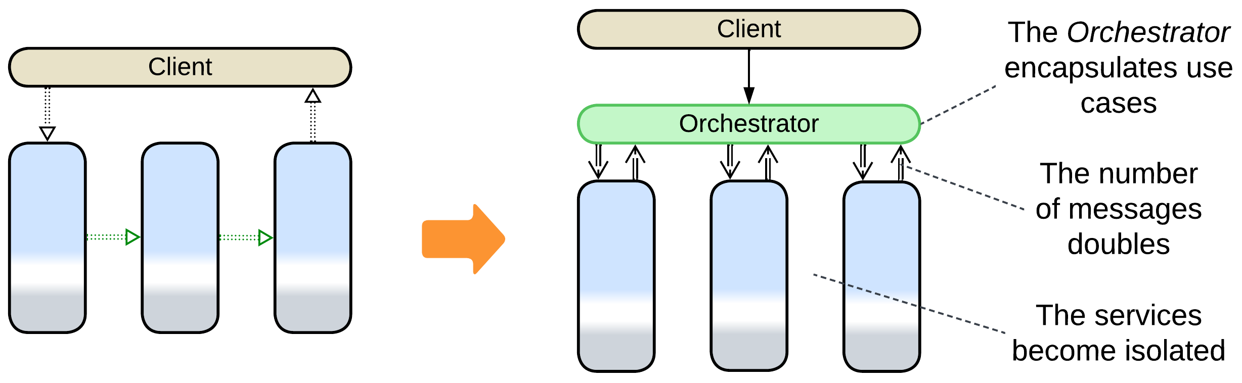 - Complex use cases. Any conditional logic written as two or three lines of code with orchestration is likely to need a separate pipeline and dedicated services with choreography. Errors and corner cases are remarkably difficult to handle [FSA].