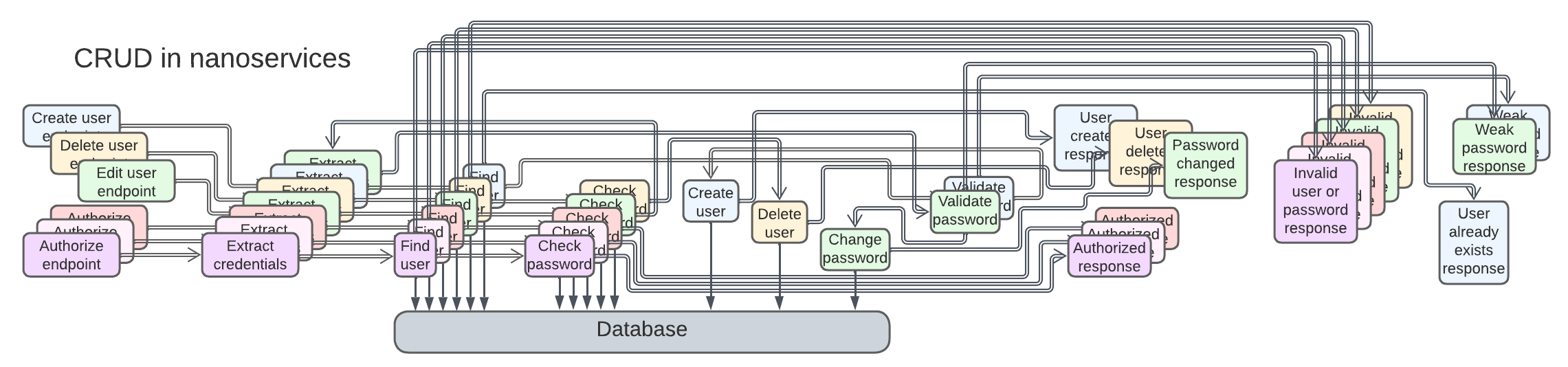 A nanoservice is, literally, a function as a service (FaaS) [DDS] – a stateless (thus perfectly scalable) component with a single input. They can run in proprietary cloud Middleware over a Shared Database and are chained into pipelines, one per use case. The code complexity stays low, but as the project grows, the integration will quickly turn into a nightmare of hundreds or thousands of interconnected services.