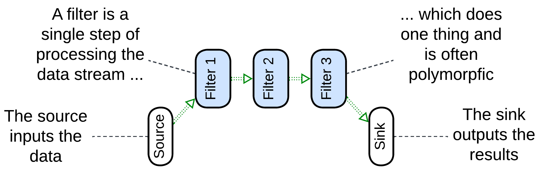 Though most commonly a filter waits for data to appear in its input pipe, processes it, and pushes the result to its output pipe, thus allowing for multiple filters to run in parallel, some implementations may let the source push the data through the entire pipeline all the way to the sink, with each filter directly calling the next filter in the line or, alternatively, the sink can pull the data by making direct upstream calls [POSA1]. The last two approaches remove the need for pipes but are then limited to using a single CPU core.