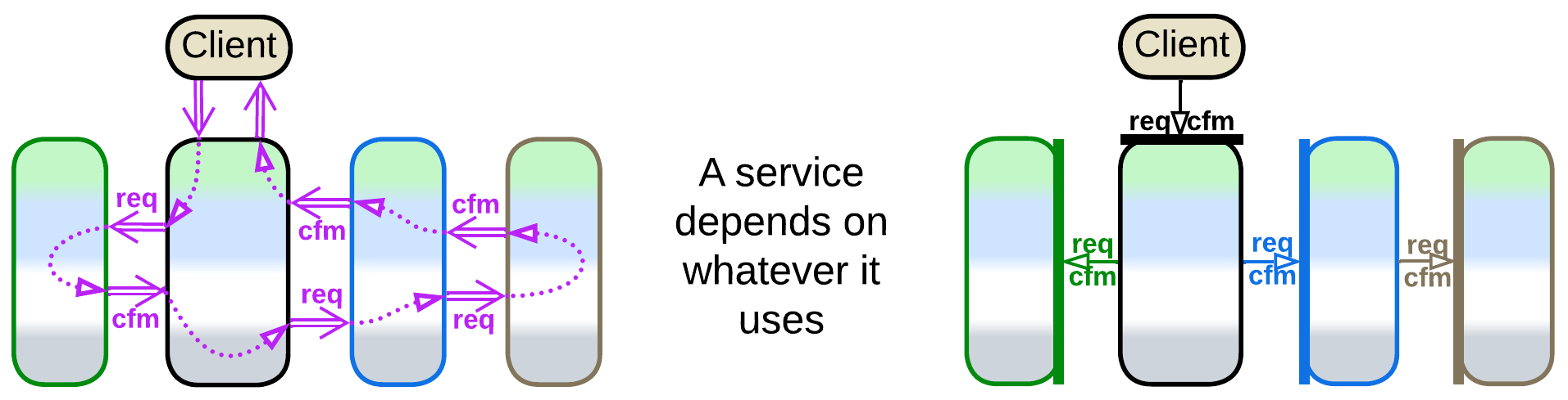 When components run inside the same process and share execution threads, one component can call another. That is blazingly fast and efficient, but you should take care to protect the module’s state from simultaneous access by multiple threads (and yes, deadlocks do happen in practice). Moreover, it is hard to know what the module you call is going to call in its turn, while you are waiting on it – thus no matter how much you optimize your code, its performance depends on that of other components, often in subtle ways.