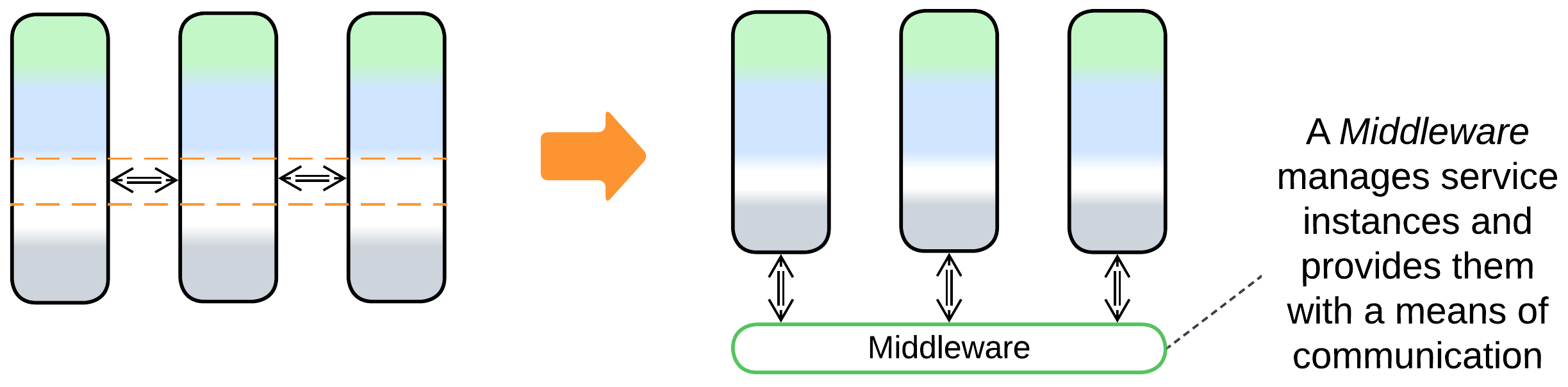 - A Middleware tracks all the deployed service instances. It mediates the communication between them and may manage their scaling and failure recovery.