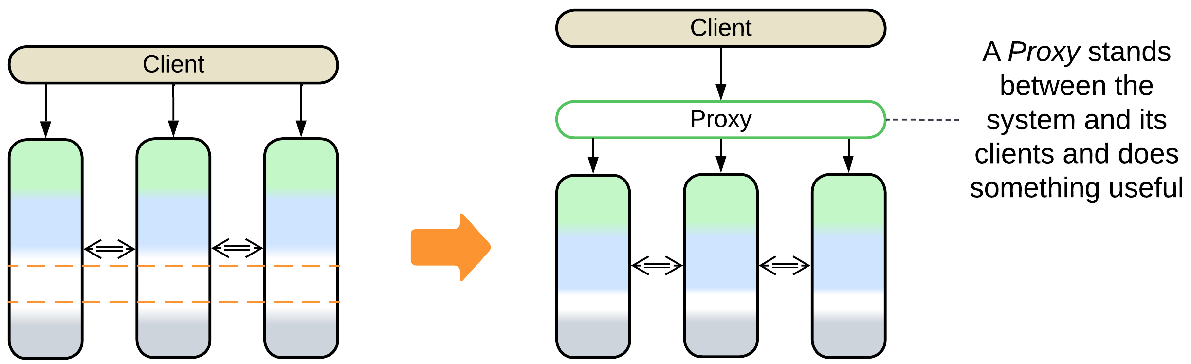 - Proxies stand between the system and its clients and take care of shared aspects that otherwise would need to be implemented by every service.