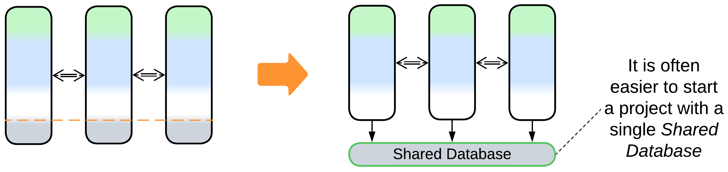 - A Shared Database simplifies the initial phases of development and interservice communication and enables the use of Services in data-centric domains.
