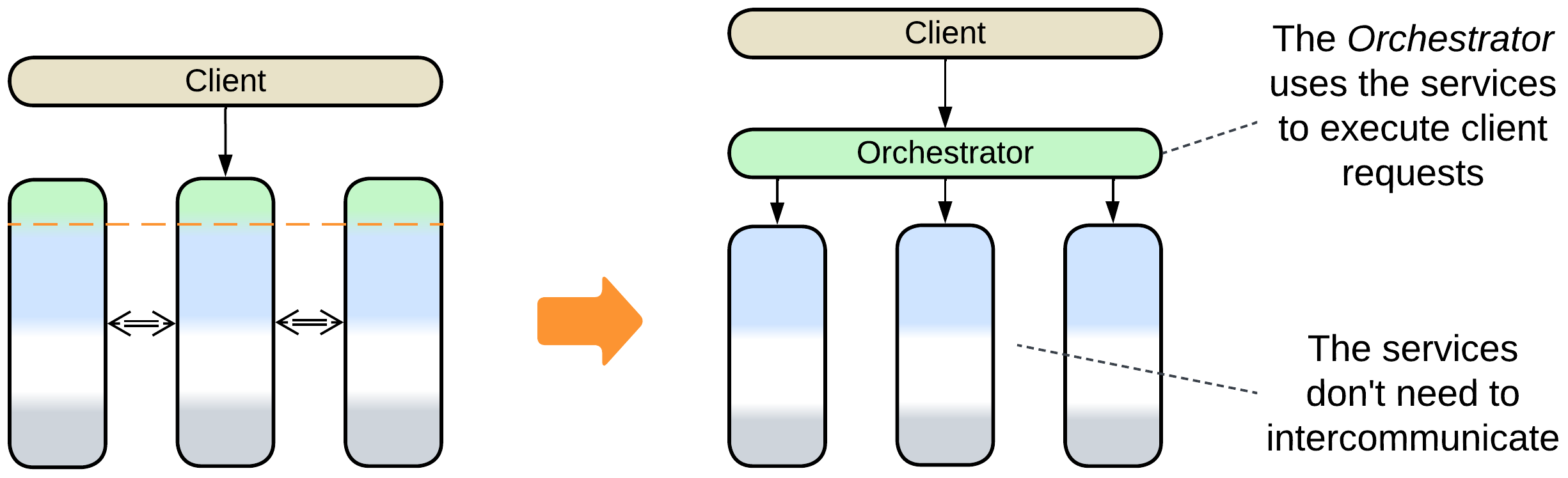 On the bright side, orchestration is human- and debugger-friendly as it keeps consecutive actions close together in the code. Therefore, synchronous interaction is the default mode of communication in many projects.