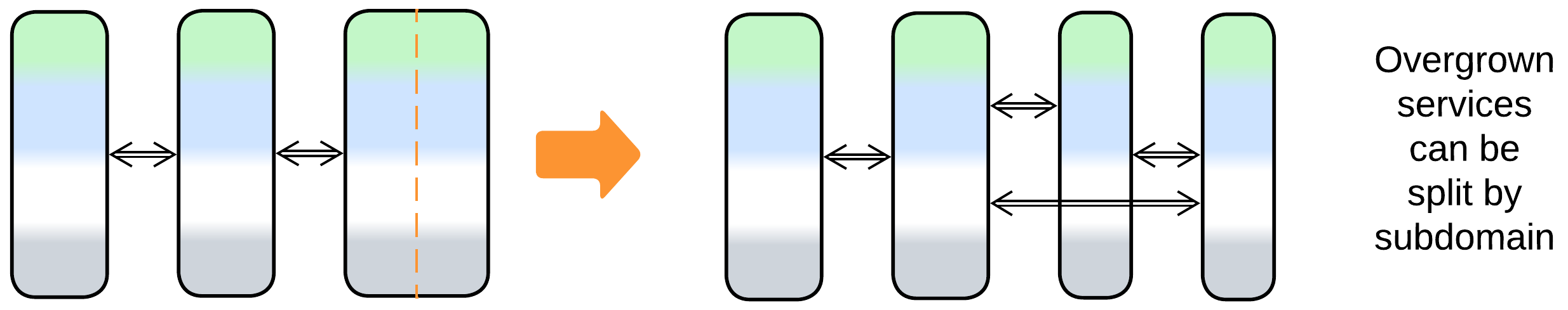 - A new feature request may emerge outside of any of the existing subdomains, creating a new service, or a service may grow too large to be developed by a single team, calling for division.