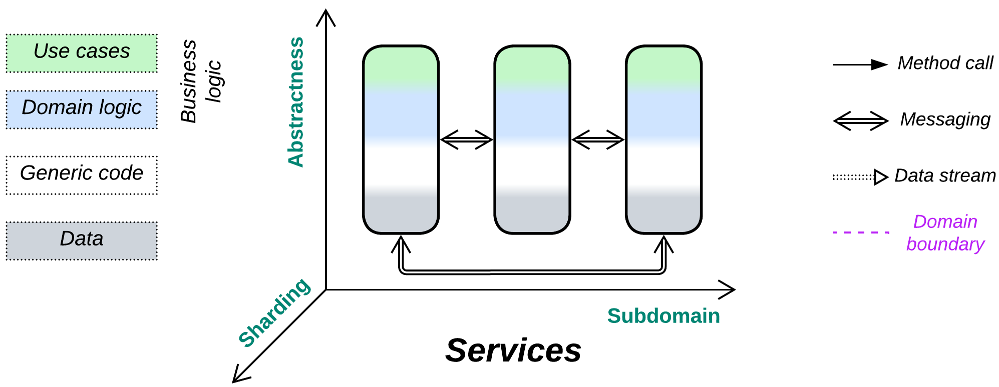 - Division by subdomain can be applied to Layers to form Service-Oriented Architecture (layers of services); to Proxy, Orchestrator, or API Gateway to make Backends for Frontends; to a (shared) database resulting in Polyglot Persistence.