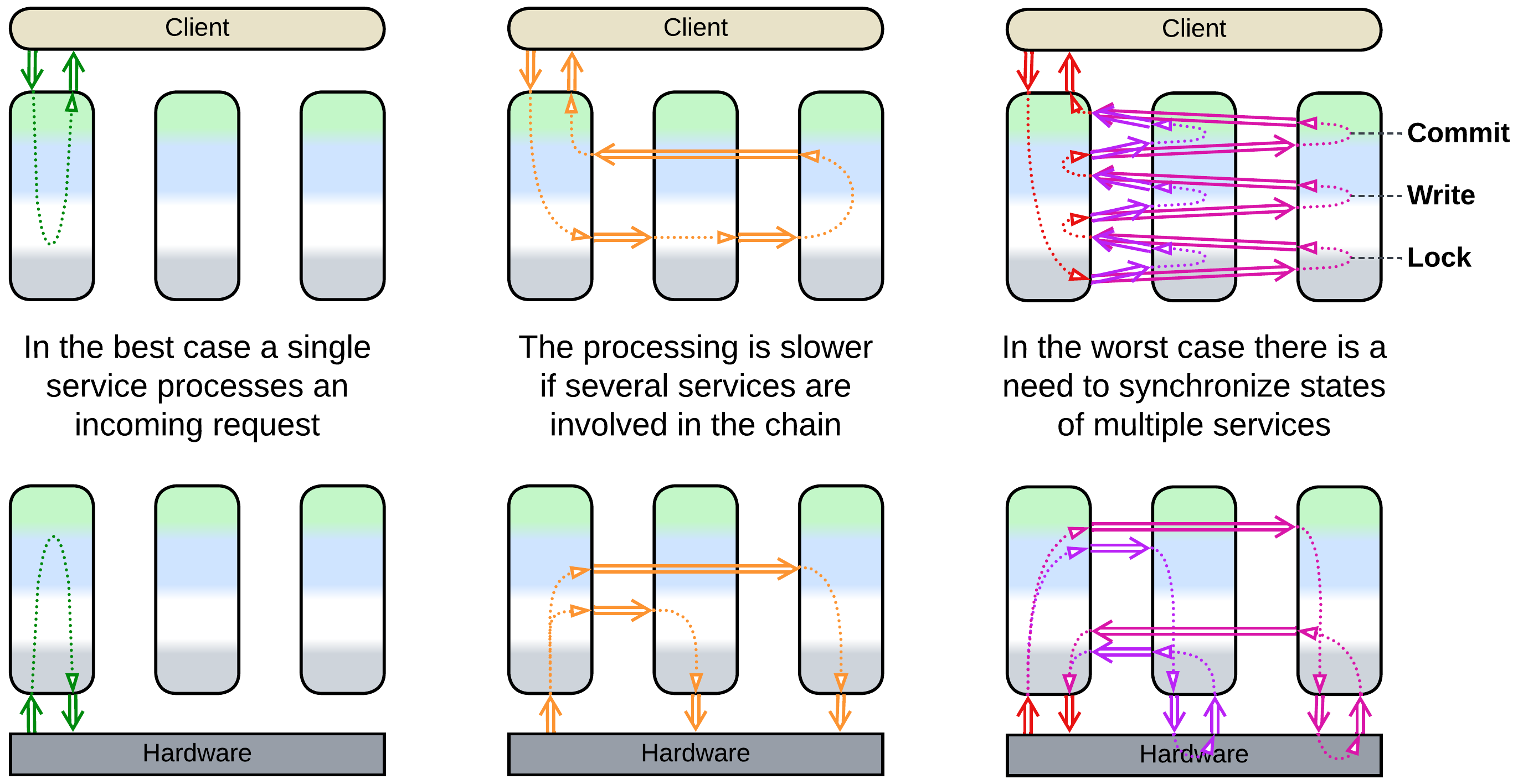In the slowest scenario a service needs to synchronize its state with multiple other services, usually via locks and distributed transactions.