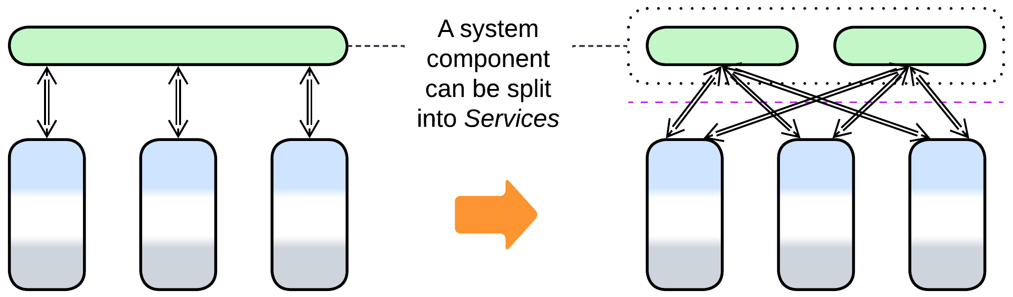Multiple instances of an individual service may be deployed to improve throughput of the system. However, such a case will likely need a Middleware or Load Balancer to distribute interservice requests among the instances and a Shared Repository to store and synchronize any non-shardable (accessed by several instances) state.