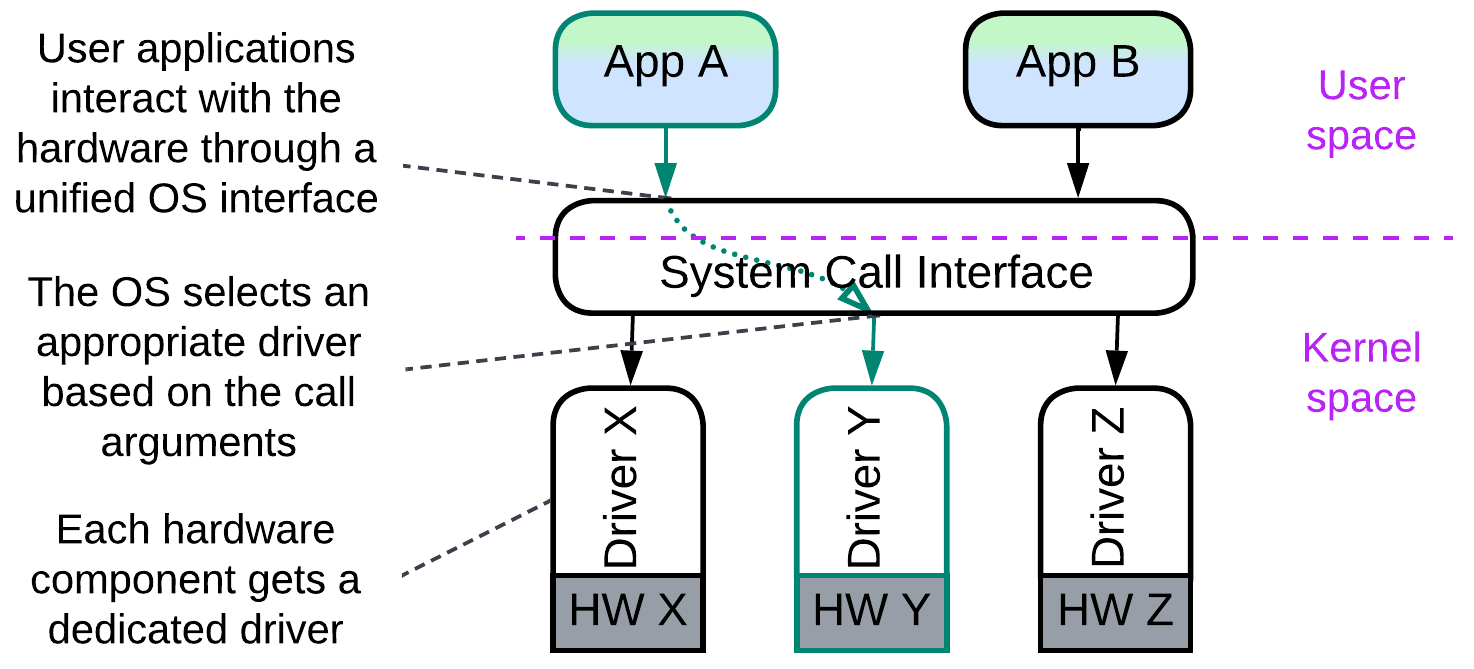 An operating system must run efficiently with an unpredictable combination of hardware components, any of which can come from different manufacturers. It is impossible to know all the combinations beforehand. Thus it employs one service (called driver) per hardware device. A driver adapts a manufacturer- and model-specific hardware interface to the generic interface of the OS kernel, allowing for the kernel to operate the hardware it controls without the detailed knowledge of the model. Internally, a driver is usually layered: