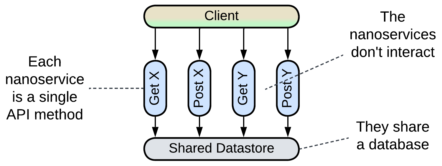 Though Nanoservices are defined by their size (a single function), not system topology, I want to mention a specific application from Diego Zanon’s book Building Serverless Web Applications. That example is interesting because it comprises a single layer of isolated functions (each providing a single API method) which may share functionality by including code from a common repository. As nanoservices of this kind never interact directly (they rely on a Shared Database instead) the common drawbacks of Services (poor debugging and high latency) don’t apply to them.