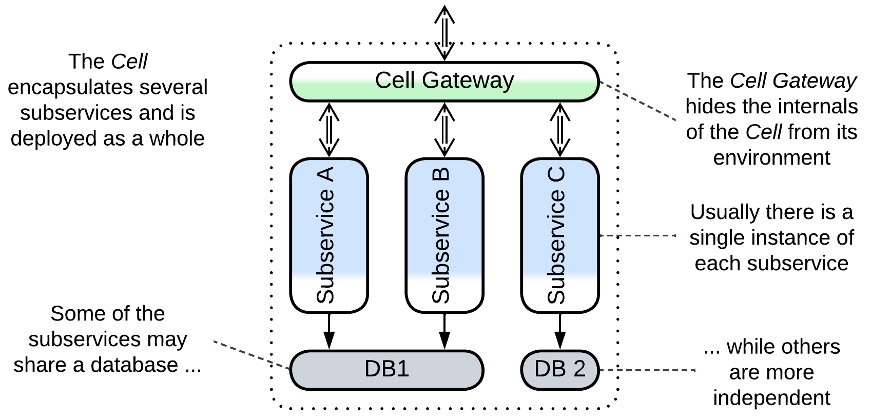 - A Cell is a service which is subdivided into several services that share an API Gateway and may share a database and/or a Middleware. All of the components of a Cell are usually deployed together. That helps when dealing with overgrown services without increasing the operational complexity of the system – but only if the Cell’s components are loosely coupled.