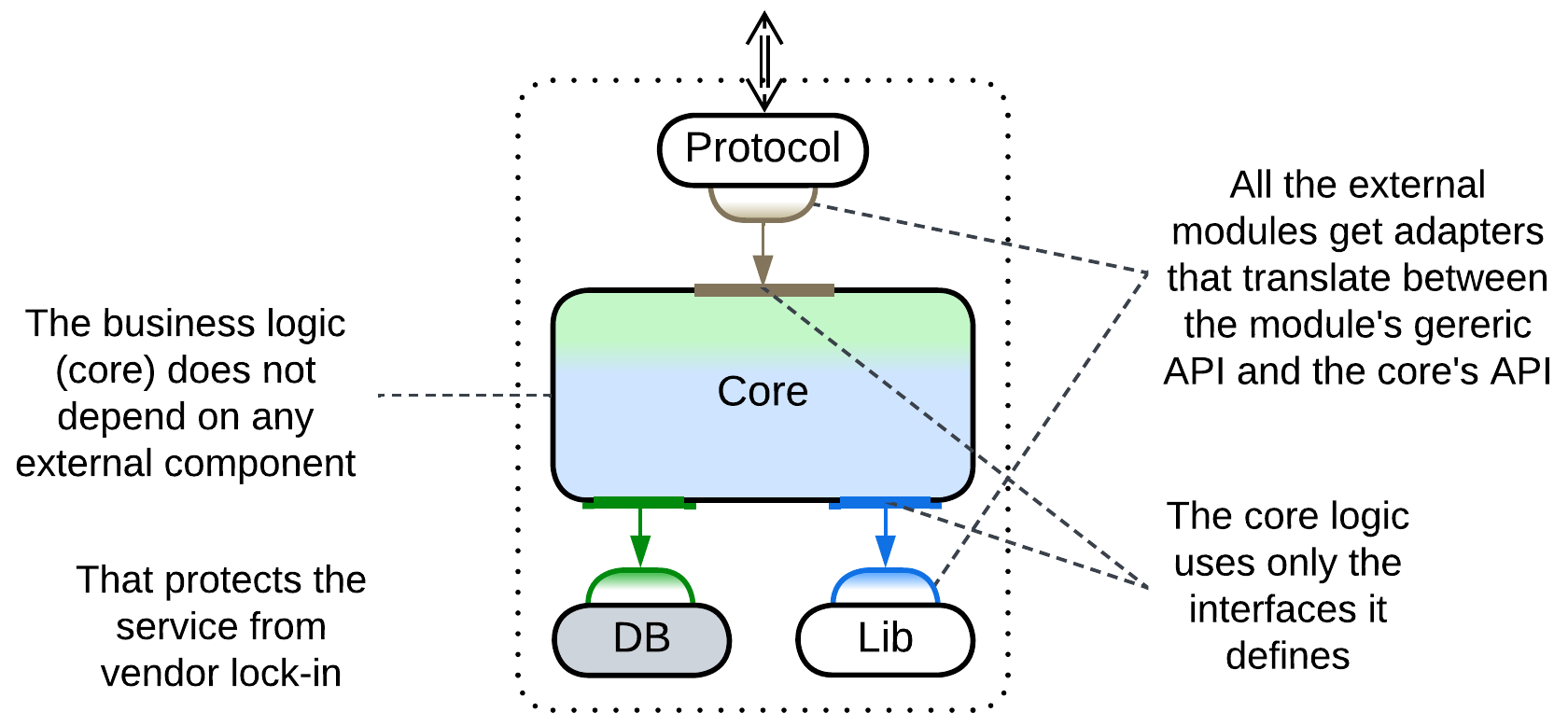 A hexagonal service has its external dependencies isolated behind vendor-agnostic interfaces.