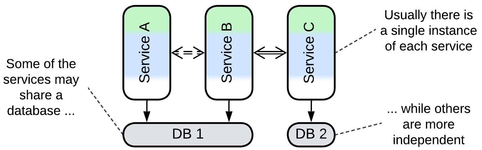- Polyglot Persistence or CQRS may be used inside a service to improve the performance of its data layer.