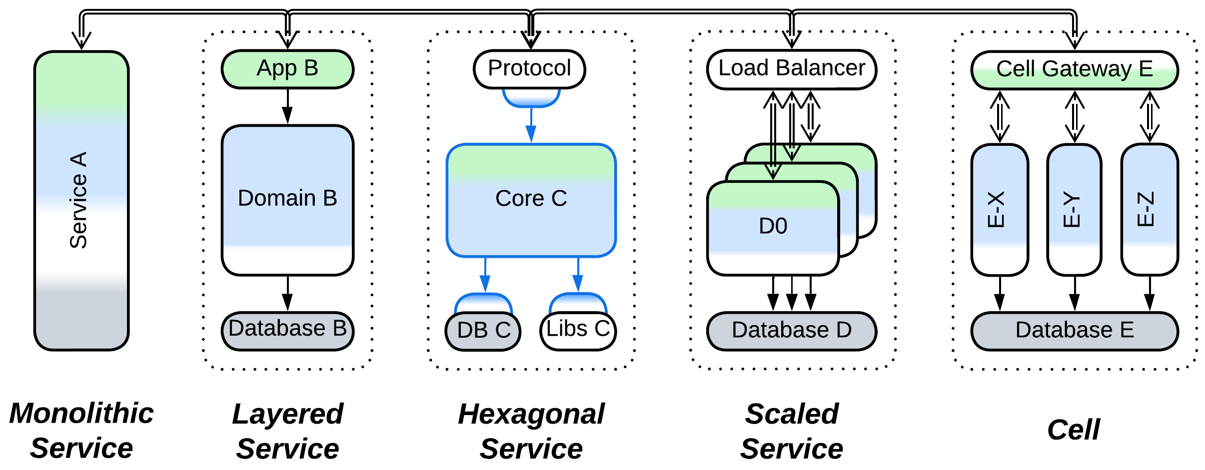 - Each service can be implemented by Layers (making a layered service), Hexagonal Architecture, or a Cell.
