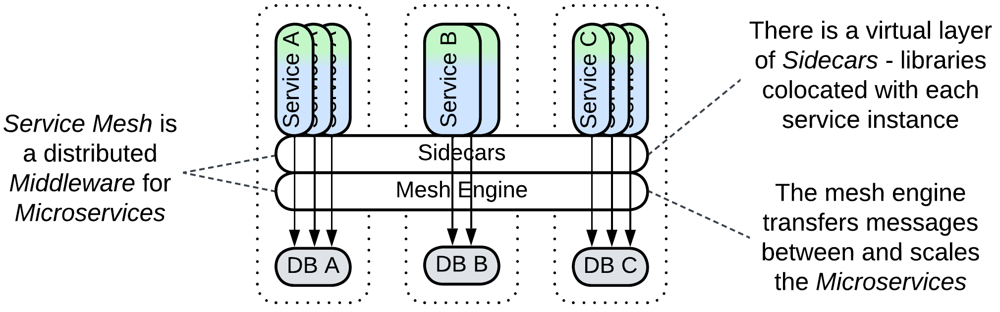 - Sidecars [DDS] of a Service Mesh make a virtual layer of shared libraries for the Microservices it hosts.