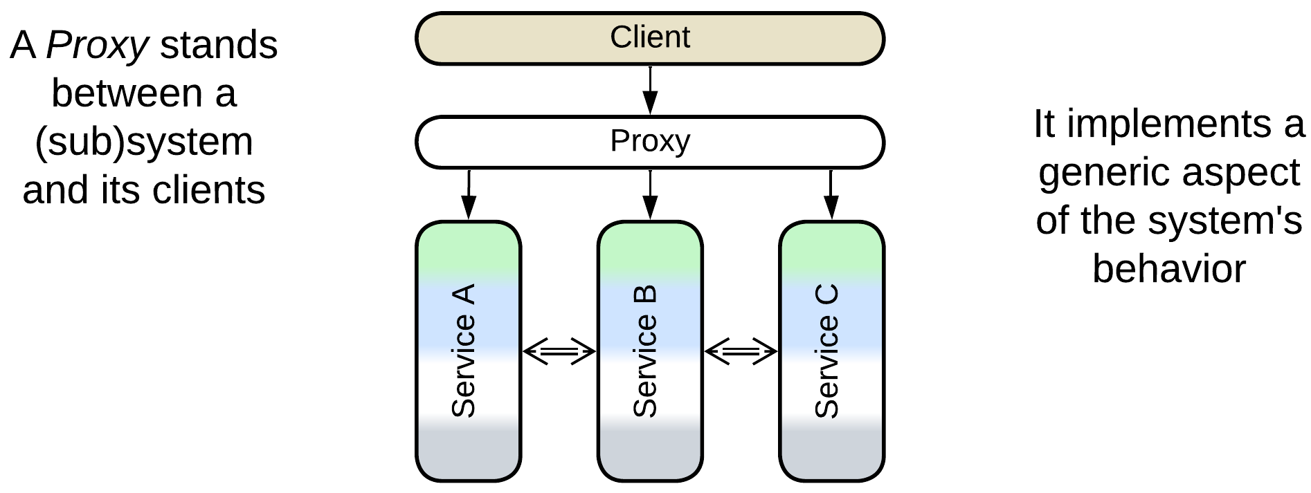 A Proxy mediates between a system and its clients, transparently taking care of some generic functionality.
