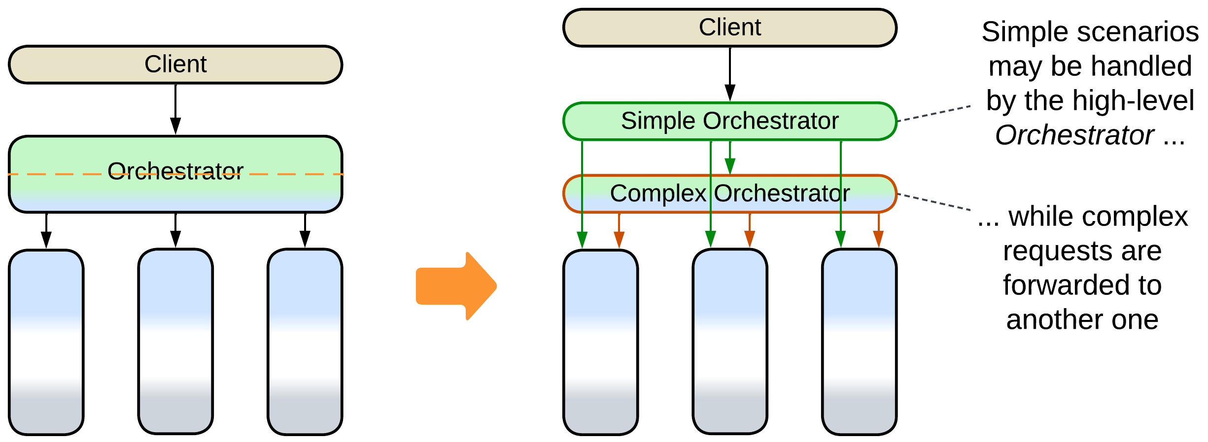 An Orchestrator takes care of global use cases (those involving multiple services) thus allowing each service to specialize in its own subdomain and, ideally, forget about the existence of all the other services. This way the entire system’s high-level logic (which is subject to frequent changes) is kept (and deployed) together, isolated from usually more complex subdomain-specific services. Dedicating a layer to global scenarios makes them relatively easy to implement and debug, while the corresponding development team that communicates with clients shelters other narrow-focused teams from disruptions. The cost of employing an Orchestrator is both degraded performance when compared to basic Services that rely on choreography [FSA, MP] and some coupling of the properties of the orchestrated services as the Orchestrator usually treats every service in the same way.