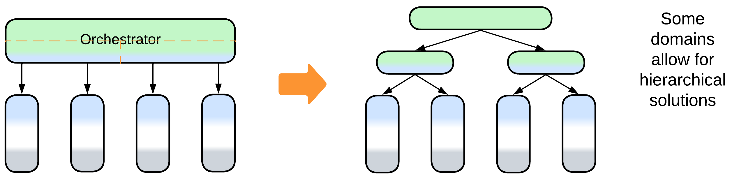 In large systems a single Orchestrator is very likely to become overgrown and turn into a development bottleneck (see Enterprise Service Bus). Building a hierarchy of Orchestrators may help [FSA], but only if the domain itself is hierarchical. The top-level component may even be a Reverse Proxy if no use cases cross subdomain borders or if the sub-orchestrators employ choreography, resulting in a flat Cell-Based Architecture. Otherwise it is a tree-like Orchestrator of Orchestrators.