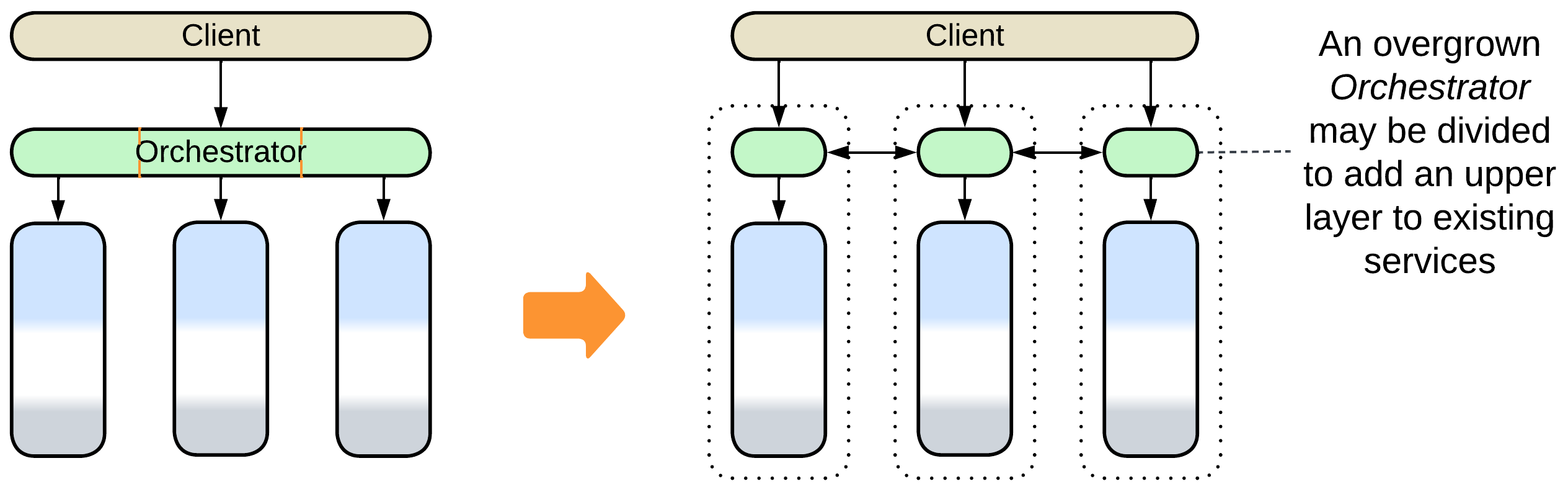 - Huge projects. At least one aspect of complexity is going to hurt. Either the number of the subdomain services and the size of their APIs will make it impossible for an Orchestrator programmer to find the correct methods to call, or the Orchestrator itself will become unmanageable due to the number and length of its use cases. This can be addressed by dividing the Orchestrator into a layer of services (resulting in Backends for Frontends or Cell-Based Architecture) or multiple layers (often yielding Top-Down Hierarchy). It is also possible to go for the Service-Oriented Architecture as that has more fine-grained components.