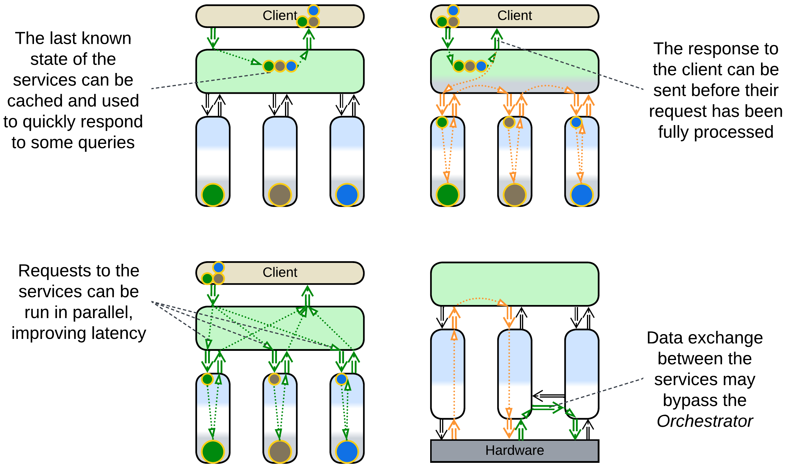 - An Orchestrator may cache the state of the orchestrated system, gaining the ability to immediately respond to read requests with no need to query the underlying components. This is very common with control systems.
