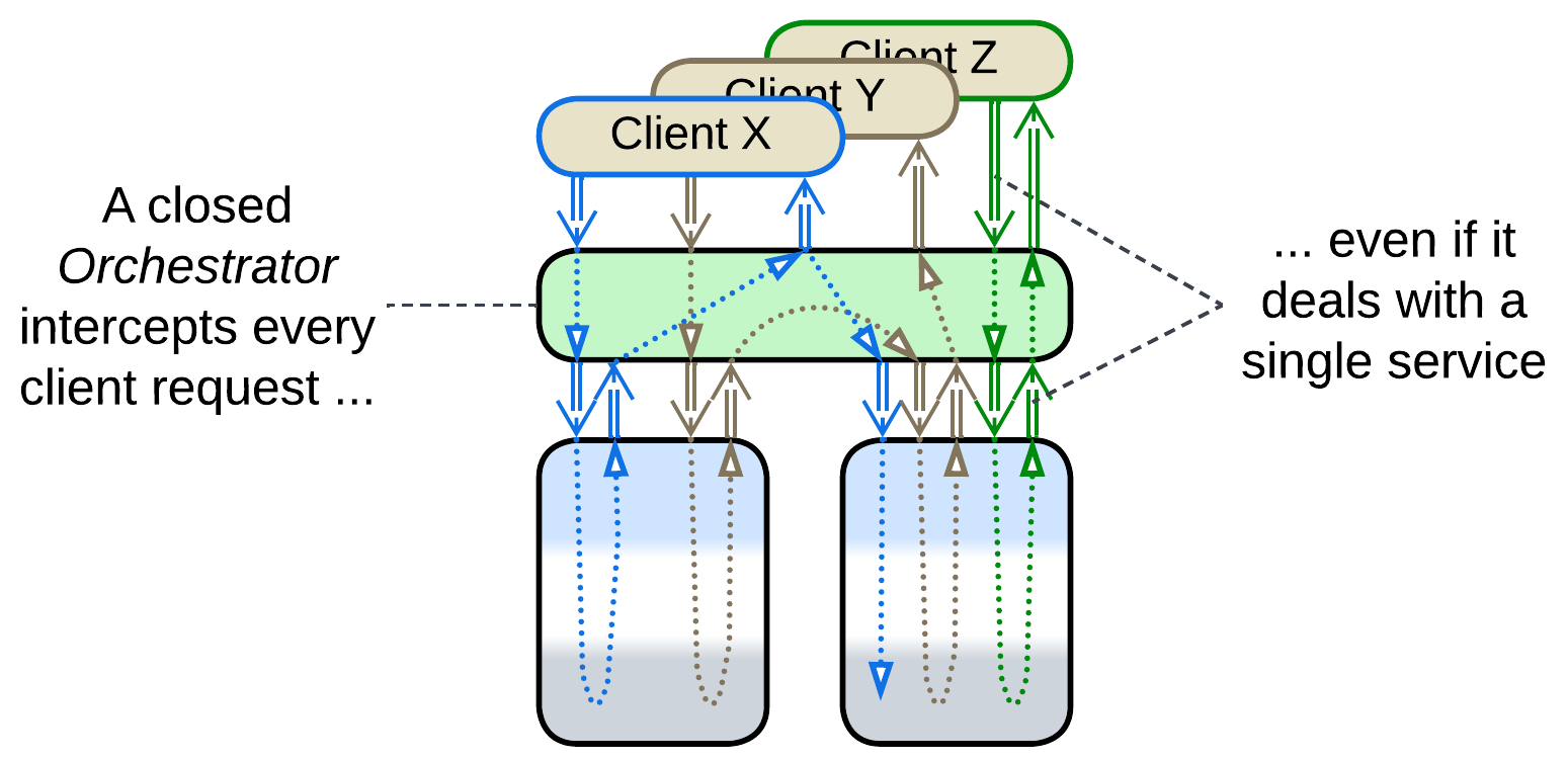 A strict or closed Orchestrator isolates the orchestrated services from their users – all the requests go through the Orchestrator, and the services don’t need to intercommunicate.