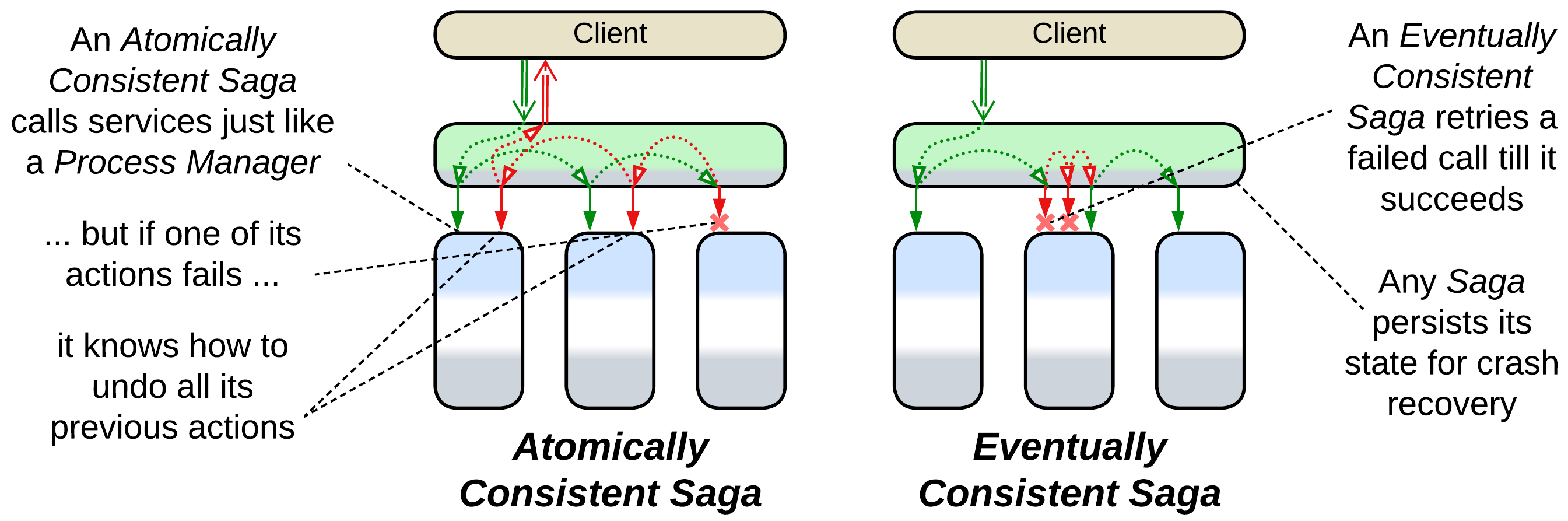 - In contrast, an Eventually Consistent Saga [SAHP] always retries its writes till all of them succeed.