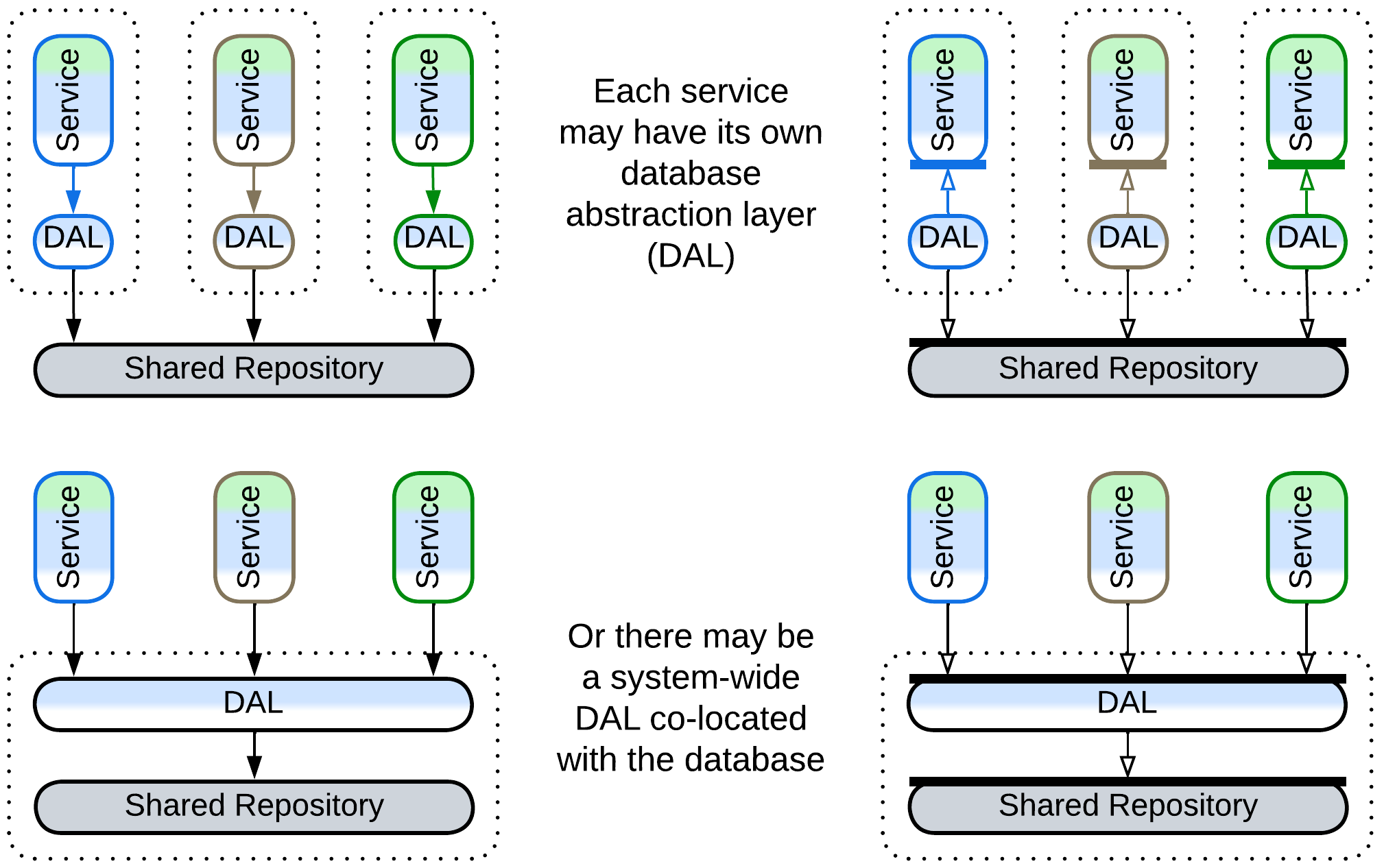 The dependency on repository technology and a data schema is dangerous for long-running projects as both of them may need to change sooner or later. Decoupling the code from the data storage is done with yet another layer of indirection which is called a Database Abstraction Layer (DAL), a Database Access Layer [POSA4], or a Data Mapper [PEAA]. The DAL, which translates between the data schema and database’s API on one side and the business logic’s SPI on the other side, may reside inside each service or wrap the database: