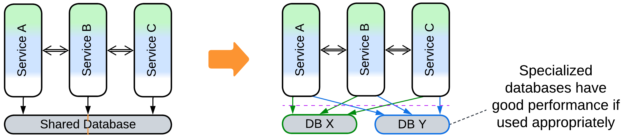 | Implements data access and synchronization (consistency) concerns | All the services depend on the schema of the shared data |