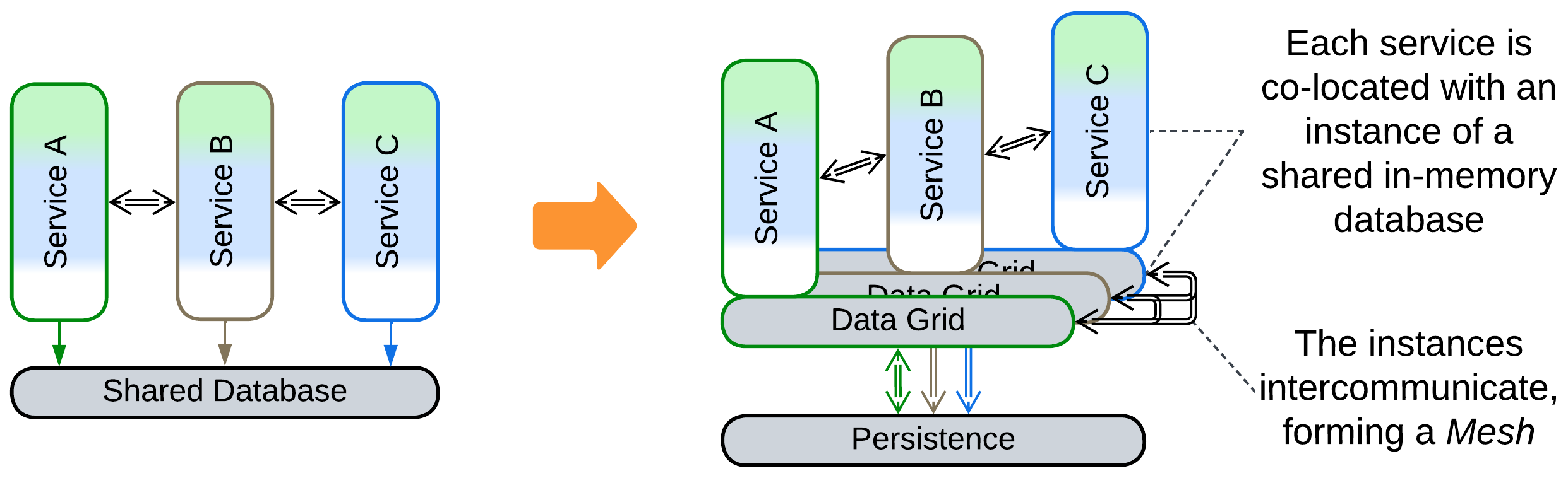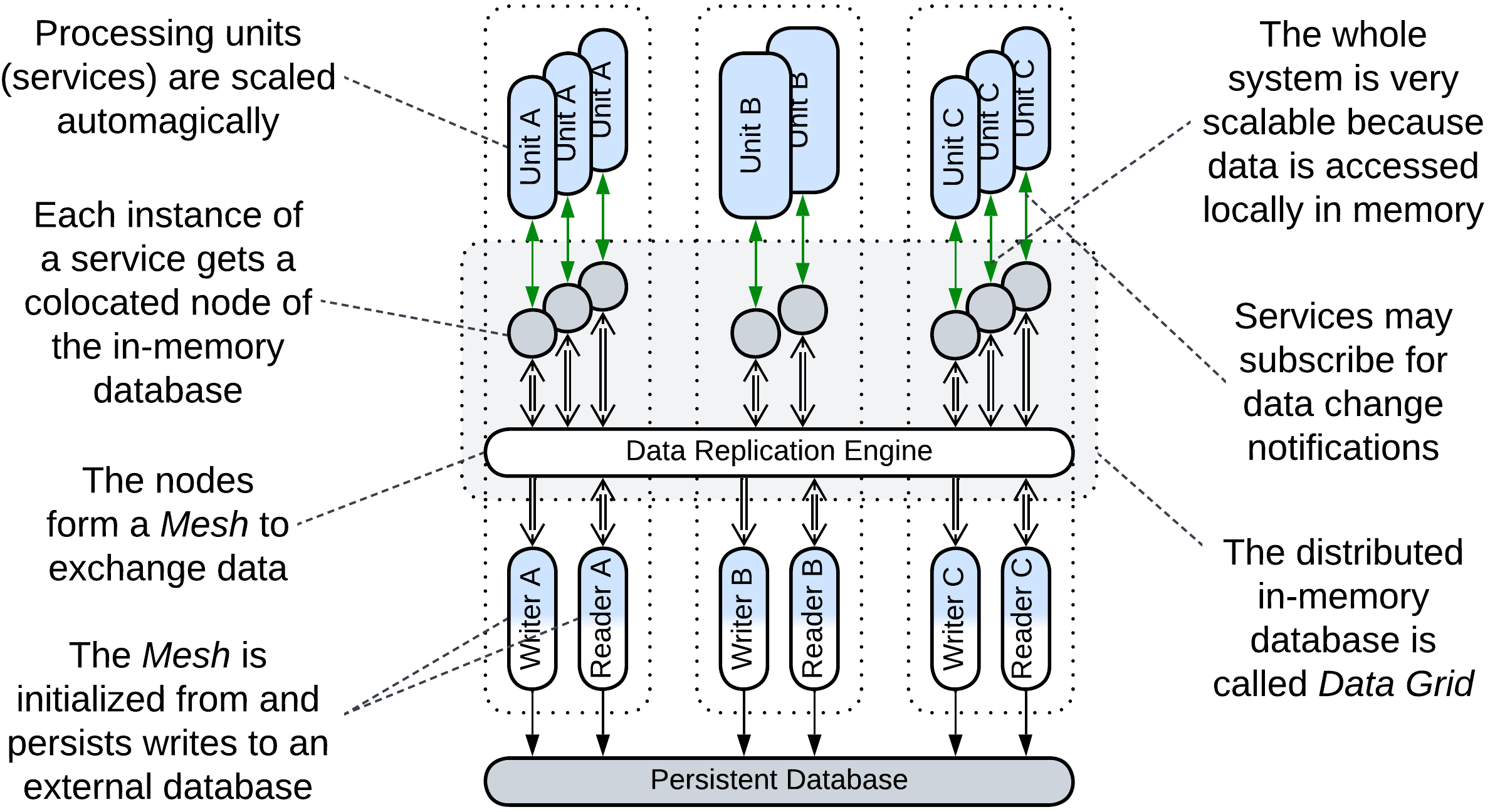 - Data Grid (Replicated Cache [SAHP]) – a Mesh-based in-memory database. Each node of the Data Grid is co-located with a single instance of a Processing Unit, providing the latter with very fast access to the data. Changes to the data are replicated across the grid by its virtual Data Replication Engine which is usually implemented by every node of the grid.