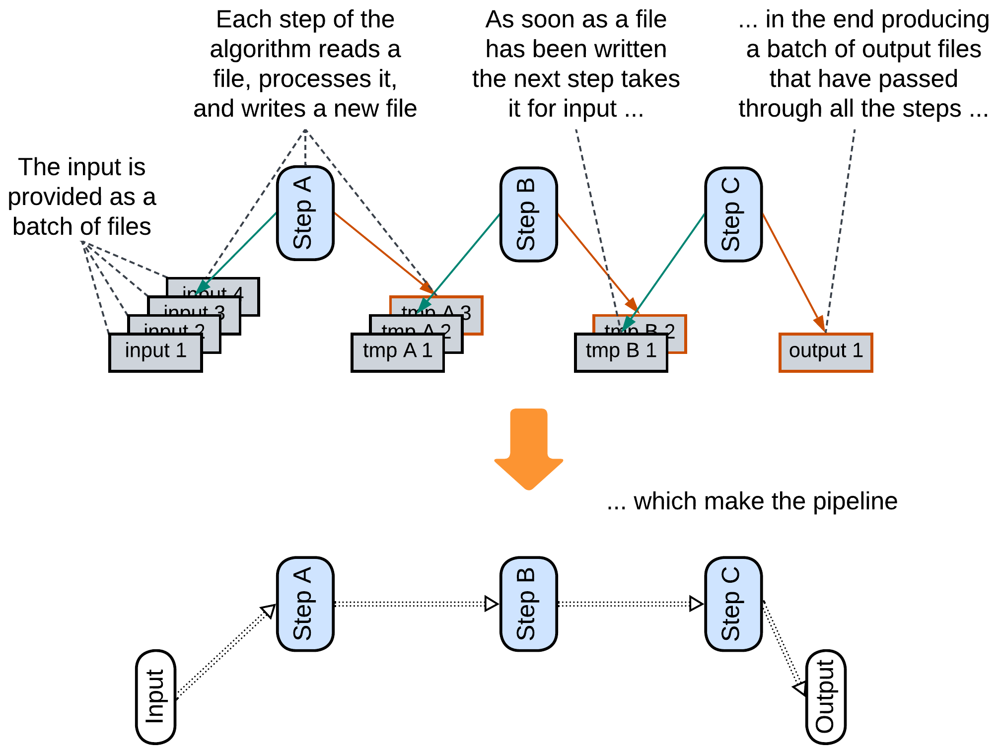 As a file system is a kind of shared dictionary, writing and reading files can be used to transfer data between applications. A data processing Pipeline which stores intermediate results in files benefits from the ability to restart its calculation from the last successful step because files are persistent [DDIA].